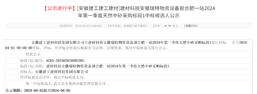 继二月中标安徽建工建材天然中粗砂和瓜子片项目,再次成功中标安徽瑞特合肥一站天然中砂一标段采购项目,中标金额均破千万。
