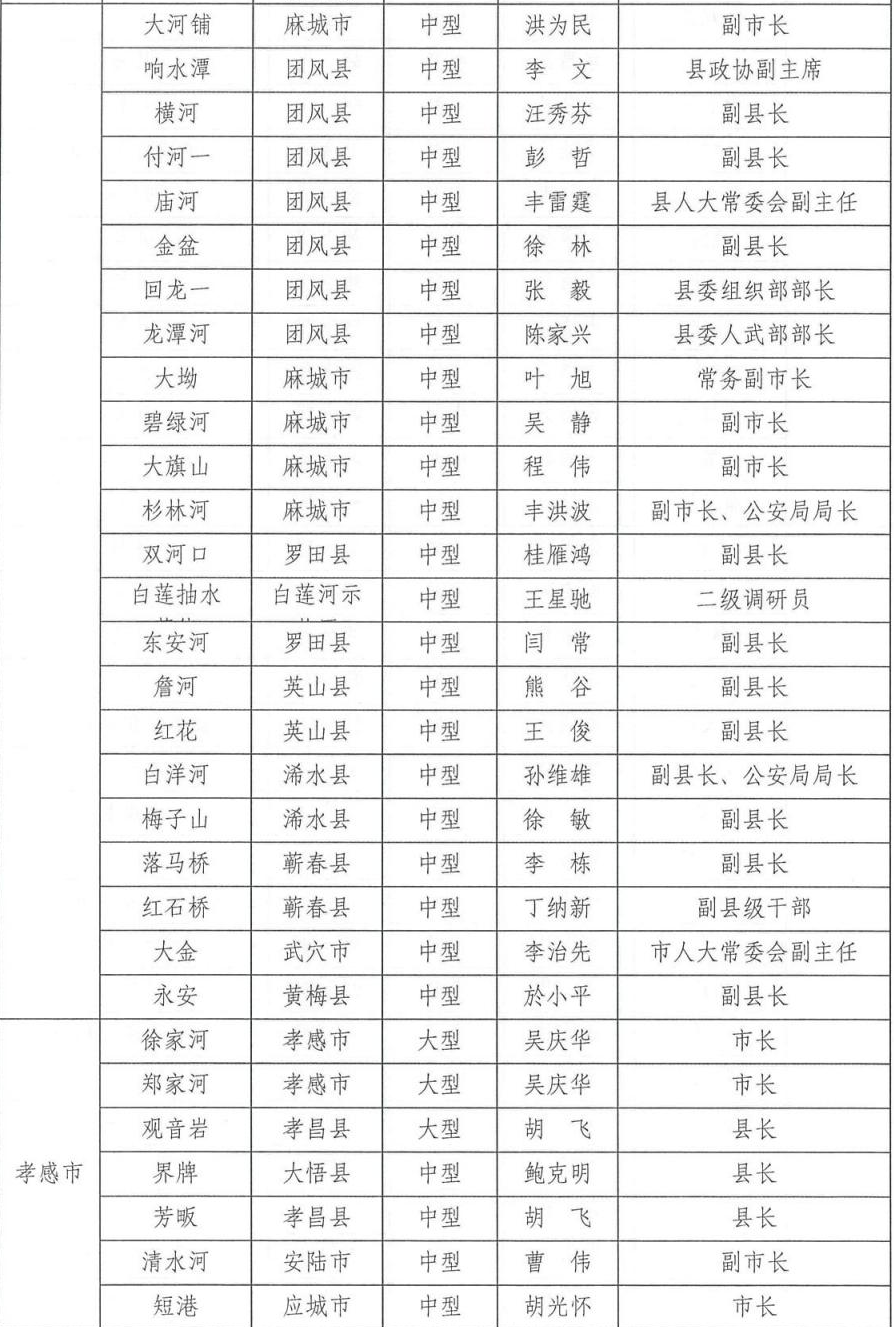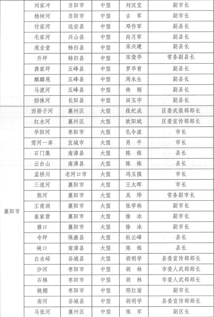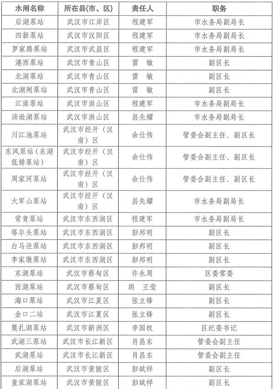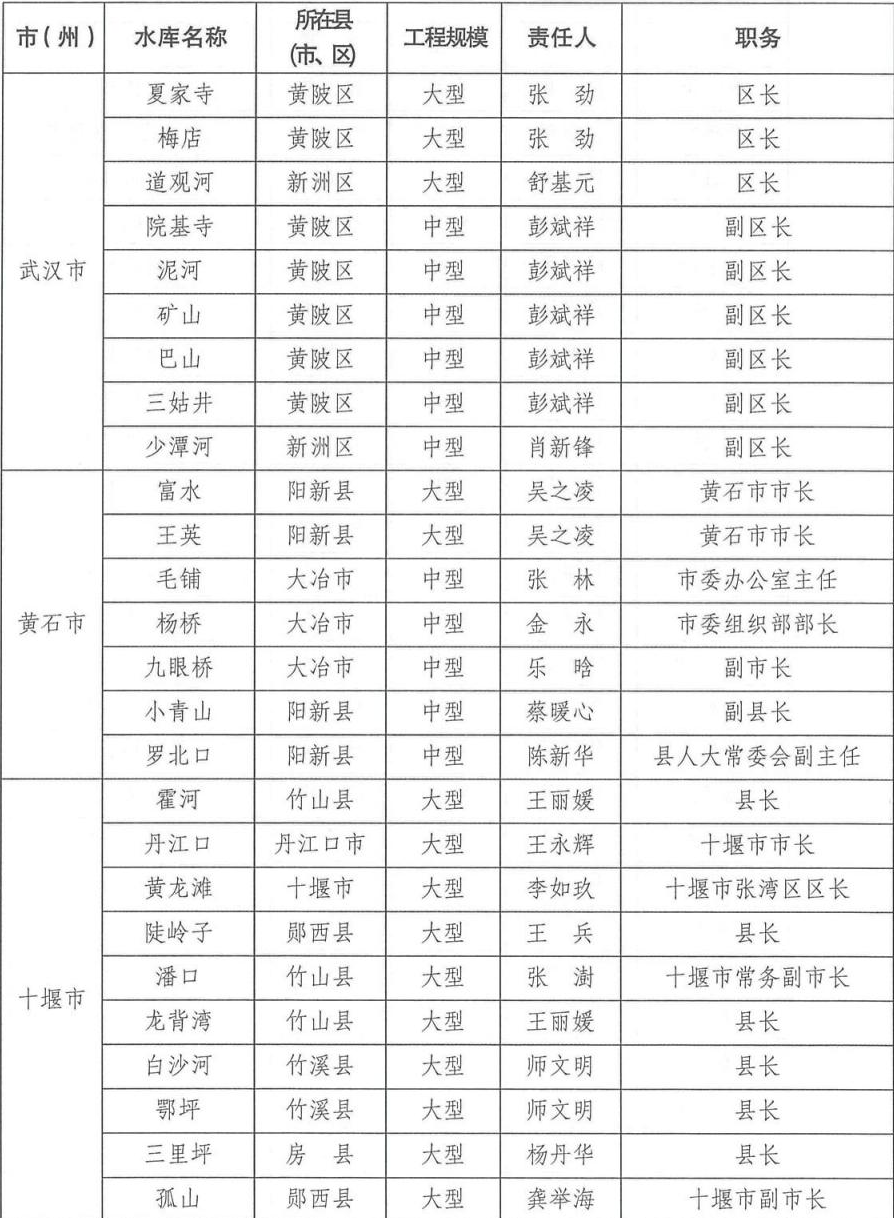 为切实做好2024年防汛抗旱工作,根据相关法律法规关于防汛抗旱工作实行各级人民政府行政首长负责制的规定,湖北省防汛抗旱指挥部通报2024年防汛抗旱行政责任人名单,包括全省防汛抗旱行政责任人,大江大河、大中型水库、大型水闸、主要蓄滞洪区、大型排涝泵站、五大湖泊及重点防洪城市防汛行政责任人名单。具体如下: