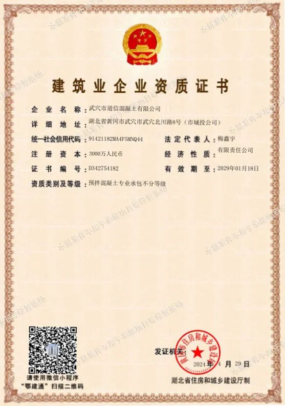 成功获得黄冈市住房和城乡建设局颁发的预拌混凝土专业承包资质证书,