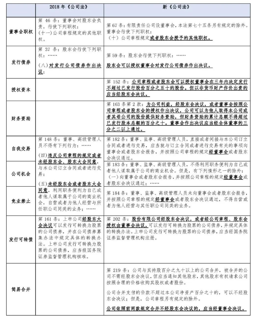 1.在董事会权利方面,增设股东会授予职权,明确董事的公司经营中心地位。2018年《公司法》对董事会职权的规定为列举主义范式,最后以公司章程规定进行兜底,形成“法定职权+章定职权”的董事会权力结构。本次修订虽延续了列举主义的规范模式,但增加了“股东会授予的其他职权”规定,董事会权力的组成变更为“法定职权+章定职权+授予职权”。本次修订中,与授予职权相呼应的新增规定有股东会可授权董事会发行公司债券、股本、可转债、提供财务资助等,同时新增的董事会法定职权还散见于董监高利益冲突处理机制和公司简易合并等相关规定中。